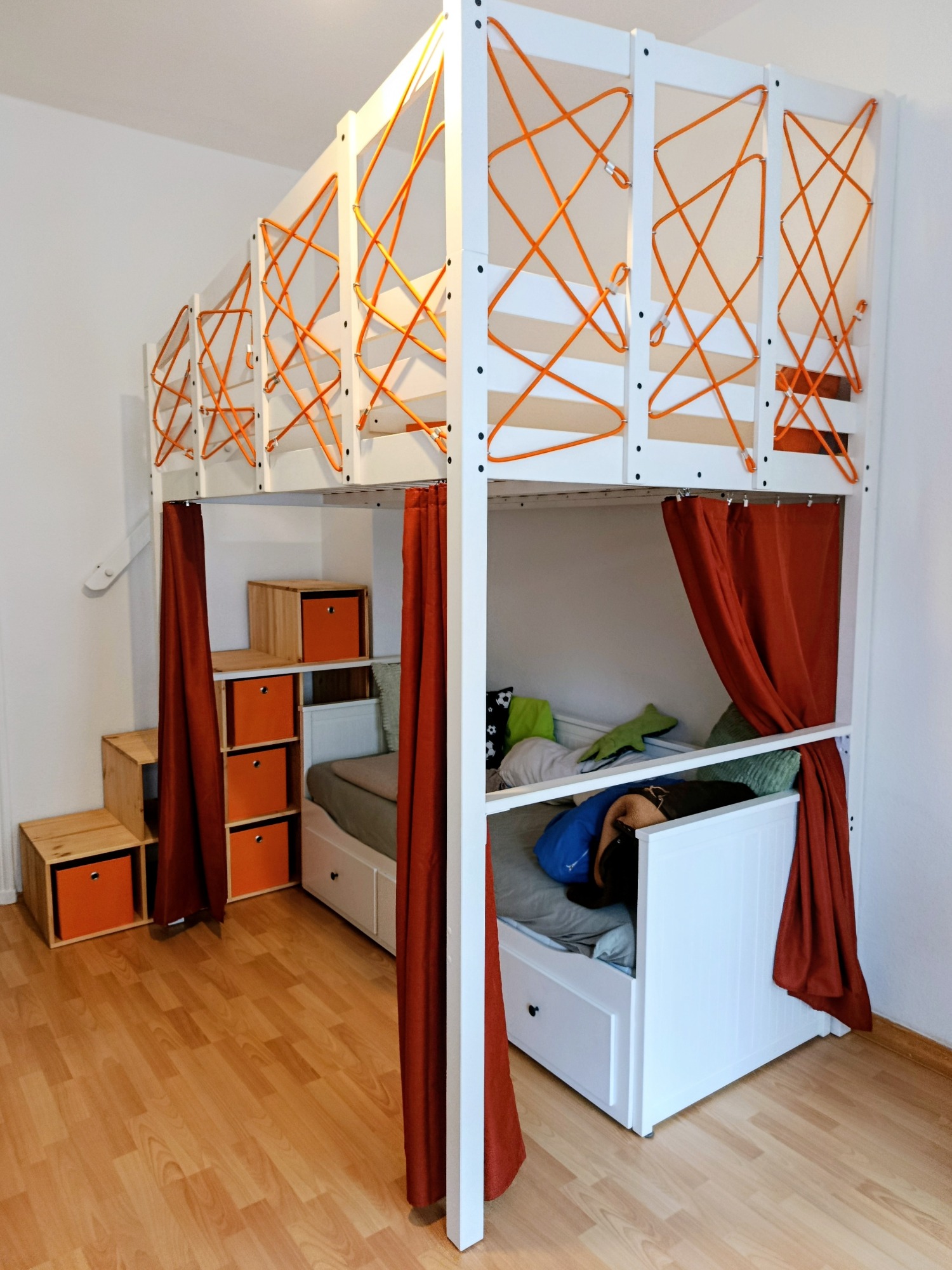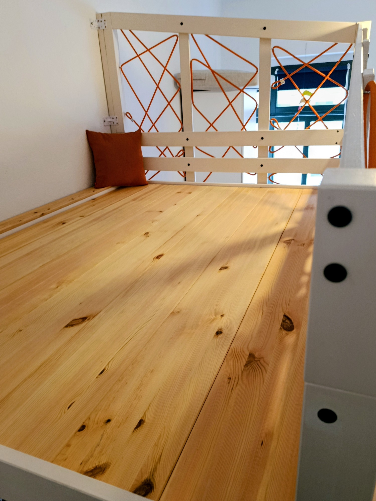 Dafür habe ich ein industriell gefertigtes Hochbett umgebaut, beplankt und um einen Rausfallschutz erweitert.