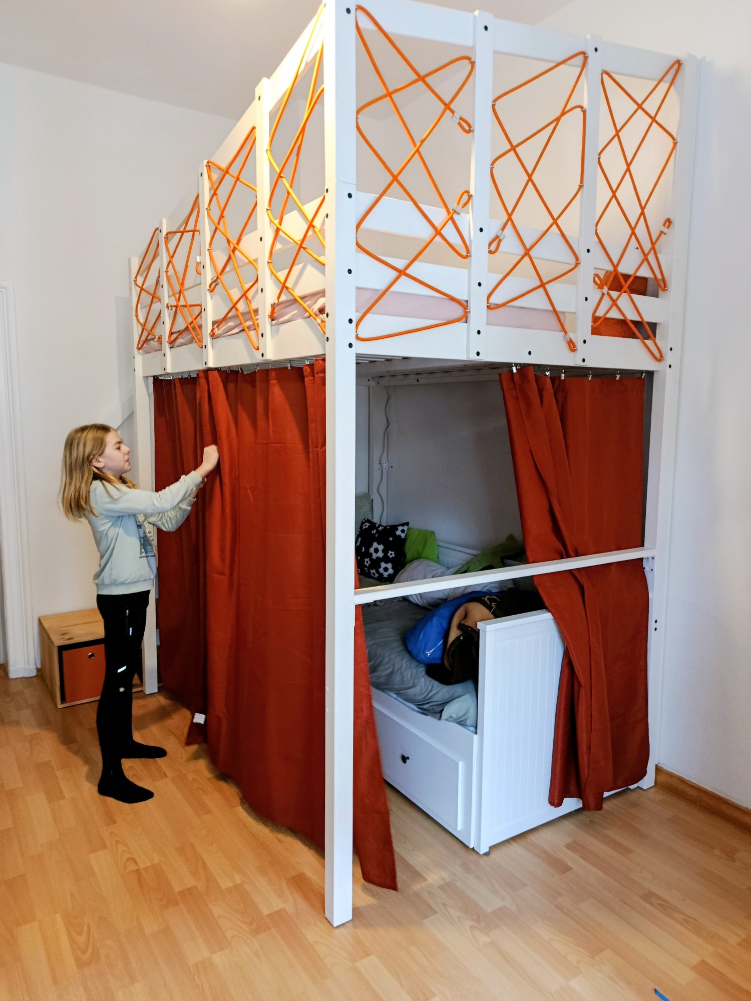 Zur Hochebene führt ein breites Treppenregal und Vorhänge ermöglichen einen Sichtschutz für das darunter eingepasste Tagesbett.